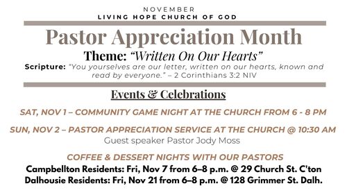 November is Pastor Appreciation Month and our theme, “Written On Our Hearts,” reminds us that as a church family, we are living letters — testimonies of our Pastors faithfulness, love, and dedication to God. Please see our Pastor Appreciation Newsletter below for the upcoming events and info!