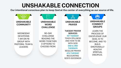 We invite you to join our “Unshakeable Connect Groups". These groups will help you to cultivate a relationship with God and learn to live out relationship with others. This year’s connect group will focus on cultivating together, as a community, our relationship with God. We will learn the process of discipleship and what that looks like. Our goal is to become, and to build, emotionally healthy spiritual disciples